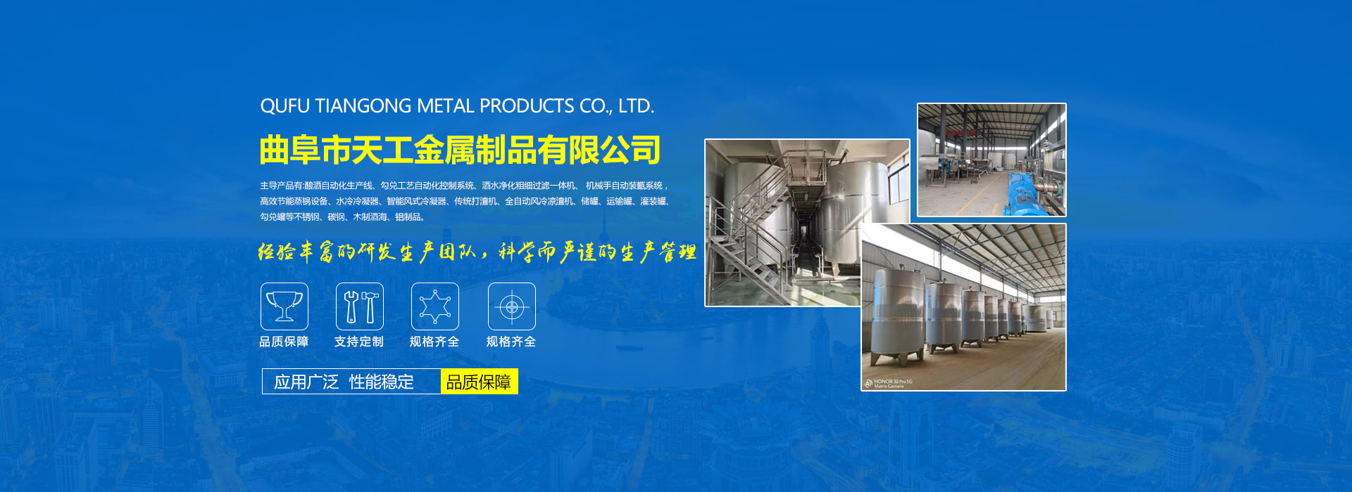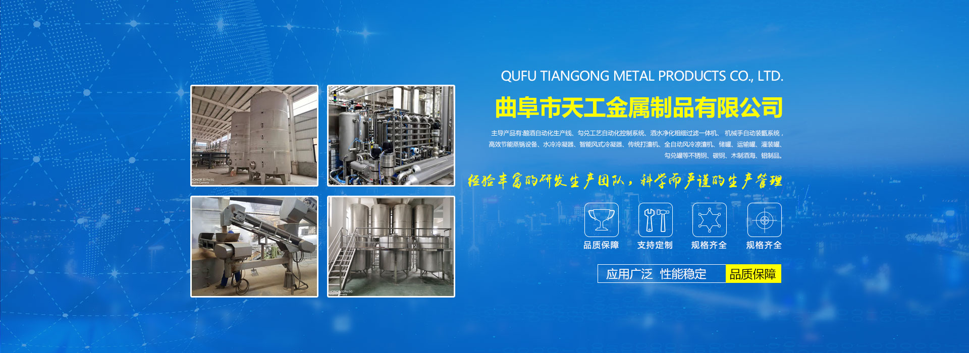 本公司是專(zhuān)業(yè)生產(chǎn)不銹鋼酒罐、不銹鋼釀造設(shè)備、不銹鋼發(fā)酵罐、釀酒、食品、生物、化工、環(huán)保設(shè)備、制藥設(shè)備的廠家。主導(dǎo)產(chǎn)品有:釀酒自動(dòng)化生產(chǎn)線、勾兌工藝自動(dòng)化控制系統(tǒng)、酒水凈化粗細(xì)過(guò)濾一體機(jī)、?機(jī)械手自動(dòng)裝甑系統(tǒng),高效節(jié)能蒸鍋設(shè)備、水冷冷凝器、智能風(fēng)式冷凝器、傳統(tǒng)打渣機(jī)、全自動(dòng)風(fēng)冷涼渣機(jī)、儲(chǔ)罐、運(yùn)輸罐、灌裝罐、勾兌罐等不銹鋼、碳鋼、木制酒海、鋁制品。各種反應(yīng)釜、發(fā)酵罐、提取罐、氣體混合罐、烘干設(shè)備等大中型設(shè)備安裝,平臺(tái)制作、工藝管線制作安裝,容器設(shè)備內(nèi)外防腐保溫。產(chǎn)品規(guī)格齊全,質(zhì)量可靠。